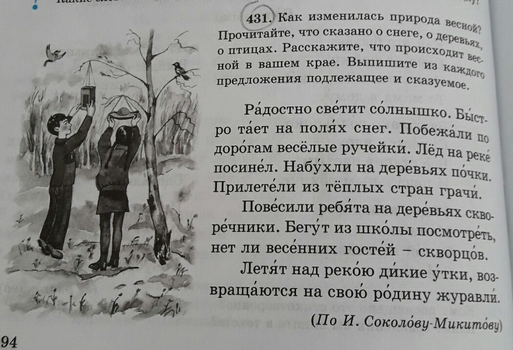 подлежащее:солнышко,снег,ручейки,лёд,почки,грачи,скворечники,утки журавли