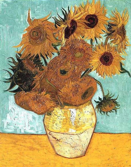 на картине изображены красивые жёлтые подсолнухи, посередине которых чёрненькие маленькие семечки. подсолнухи стоят в красивой вазе. этими подсолнухами можно любоваться вечно! они такие прекрасные и жёлтенькие...такие красивые, словно яркое солнышко в голубом небе!