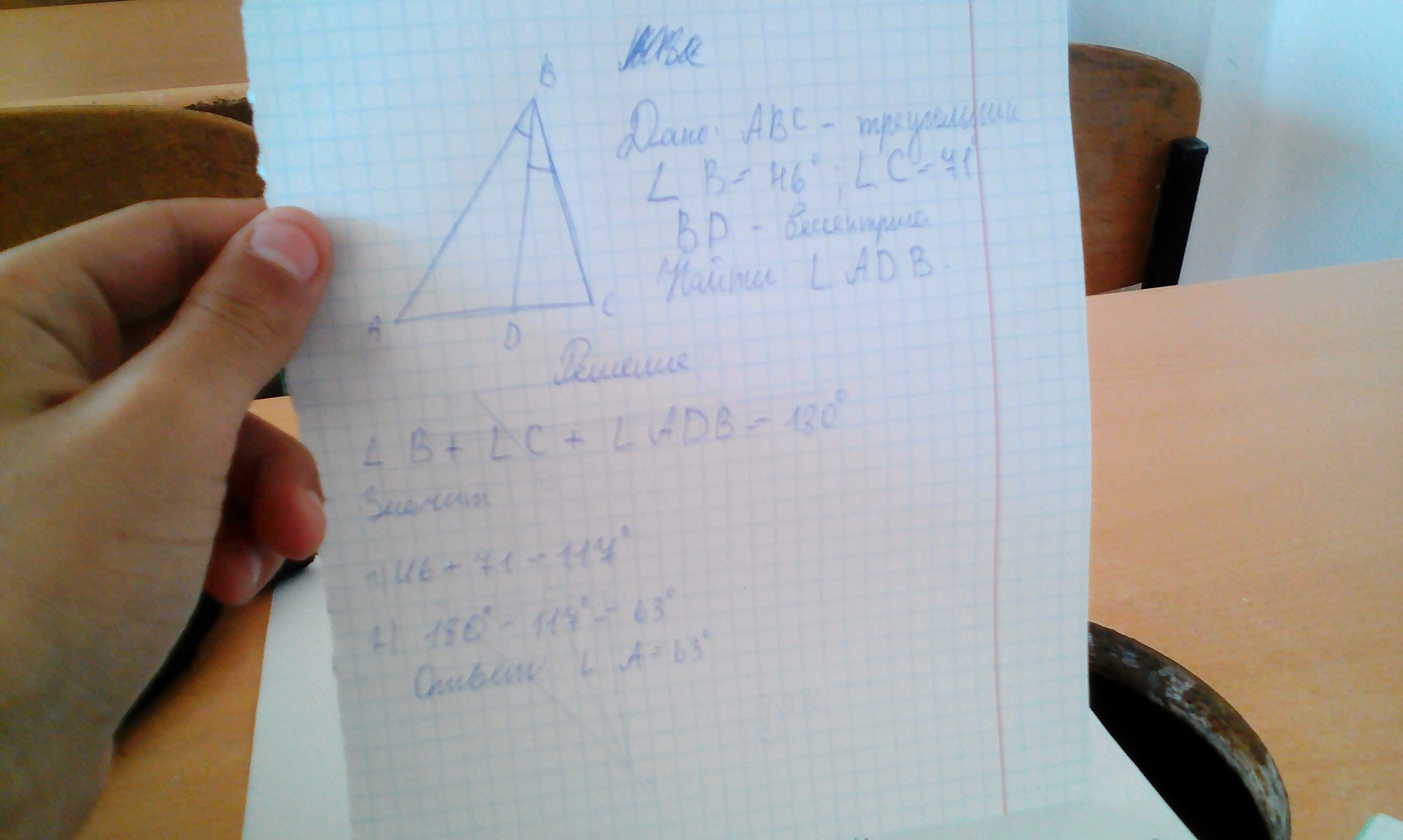 В треугольнике ABC угол B равен 46градусов, угол C равен 71 градус, BD-биссектриса. Найдите угол ADB