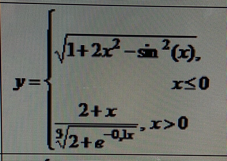 =ЕСЛИ(A1<=0;КОРЕНЬ(1+2*A1*A1-SIN(A1)*SIN(A1));(2+A1)/СТЕПЕНЬ(2+EXP(-0,1*A1);1/9))