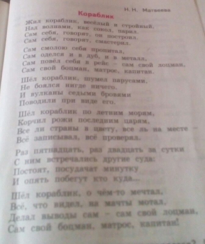 Это стихотворение звучит очень торжественно! В нём рассказывается о кораблике. Он был очень смелым, ничего не боялся. В этом стихотворении заключается очень большой смысл в этом предложении- делай выводы сам-сам свой лоцман, сам свой боцман,матрос,капитан. Изюминка этого стиха, его главный герой кораблик-неунывающий, бесстрашный персонаж который всегда веселится