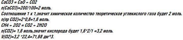 Углекислый газ получают разложением карбоната кальция массой 200г. Выход продукта составляет 80%. Рассчитайте, какой объем (н.у) кислорода будет затрачен для получения углекислого газа при сжигании метана.