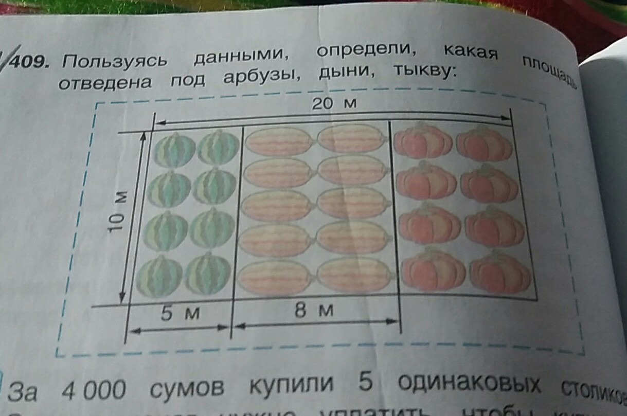 50 кв. метров отведено на арбуз,80 кв. метров на дыни,70 кв. метров на тыквы.