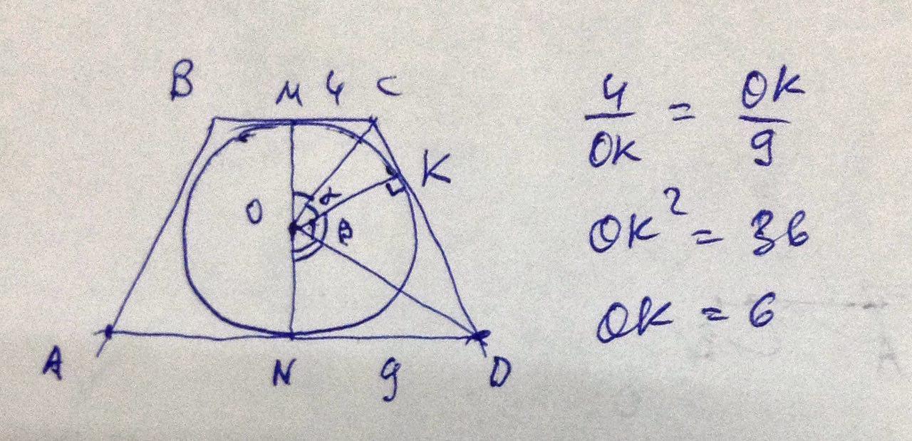 Рассмотрим трапецию, образованную диаметрами оснований. В ней MC = 4, ND = 9. MC = KC, ND = KD как касательные к окружности, проведённые из одной точки. Не сложно показать что ∠MOC = ∠KOC, ∠KOD = ∠NOD. Обозначим их α и β соответственно. Тогда 2α + 2β = 180°, значит, α + β = 90°. Значит, треугольник COD прямоугольный.