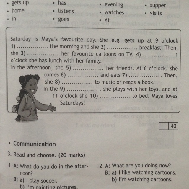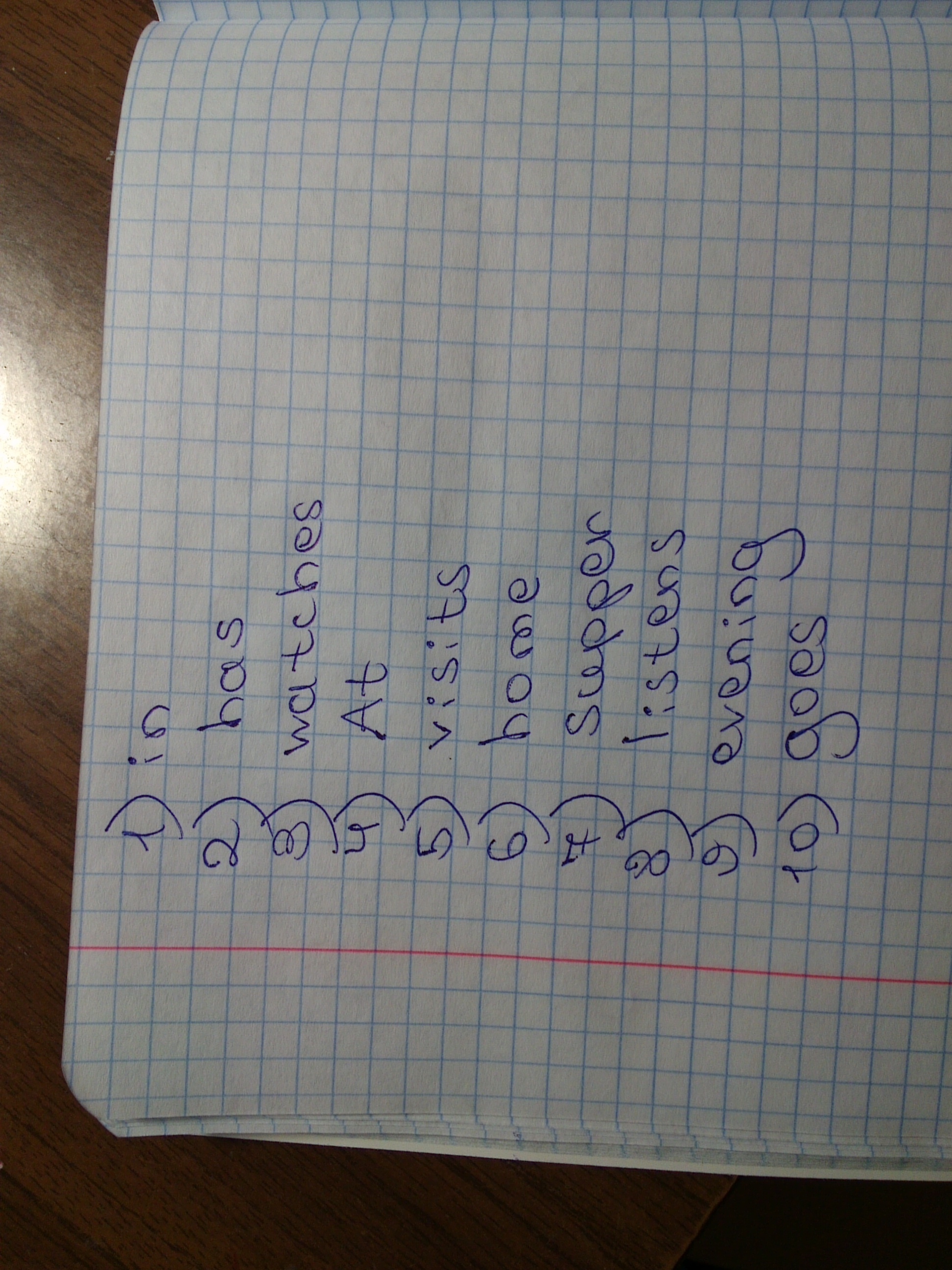 in, has, watches, at, visits, home, supper, listens, evening, goes.