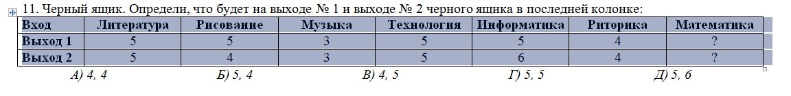 Черный ящик. Определи, что будет на выходе № 1 и выходе № 2 черного ящика в последней колонке