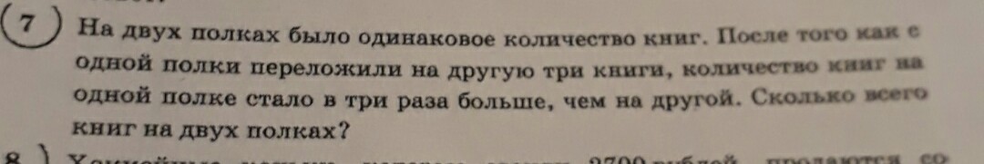 х = 6 (книг) - изначальное количество книг на каждой из двух полок.