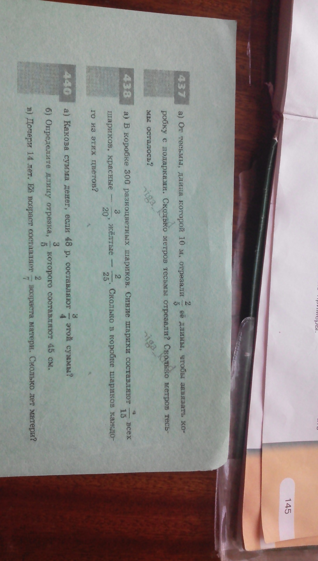 1) 10 × (2/5) = 2 × 2 = 4 (м) - длина отрезанной тесьмы.
