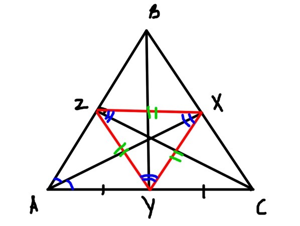 В треугольнике ABC проведены биссектриса AX, медиана BY, высота CZ. Треугольник XYZ- равносторонний. Докажите, что треугольник ABC- равносторонний.