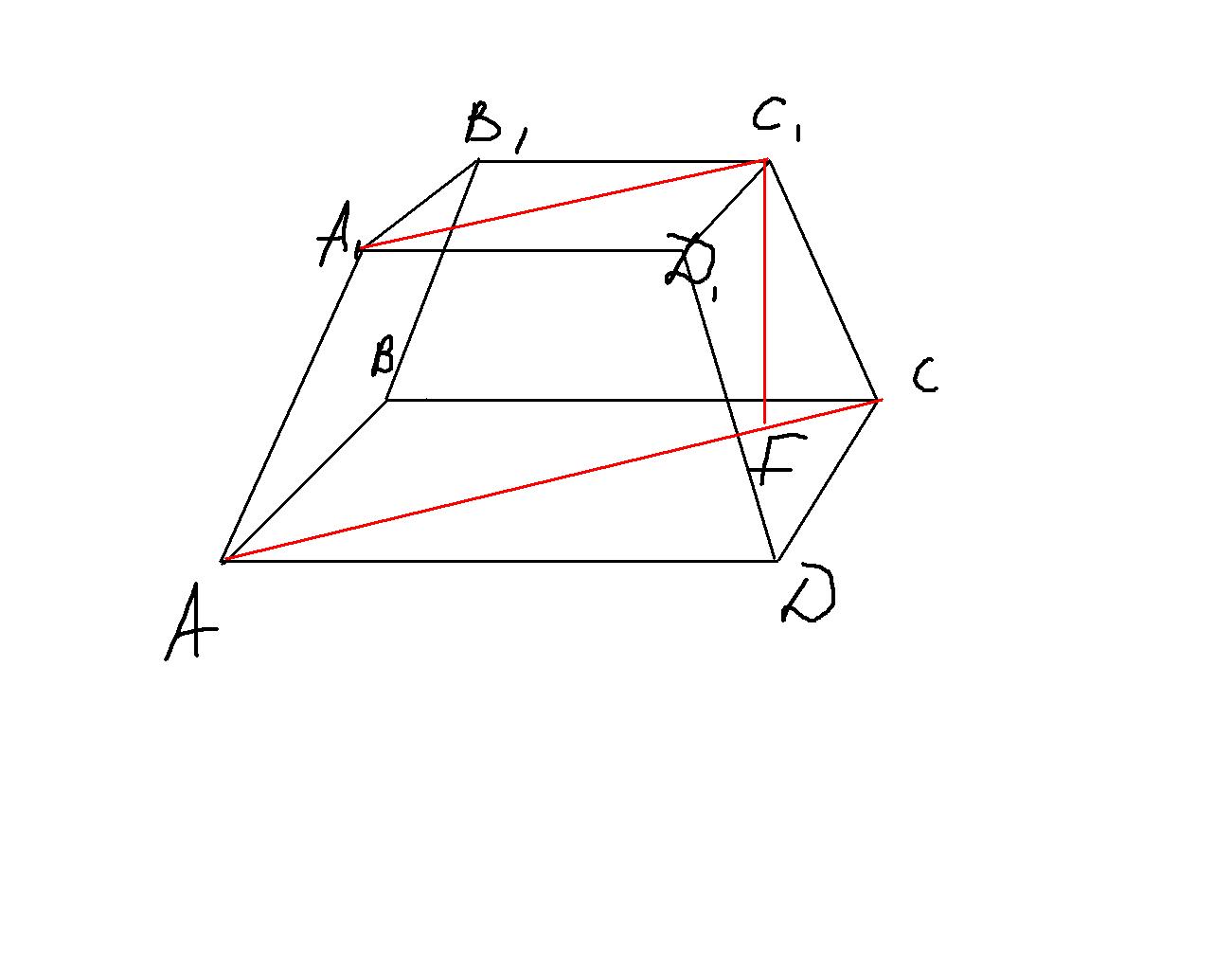 Так как основания верхней и нижней являются квадраты то диагональ которую мы хотим найти являеться диагональю прямоугольной трапеций A1C1AF, найдем диагональ оснований