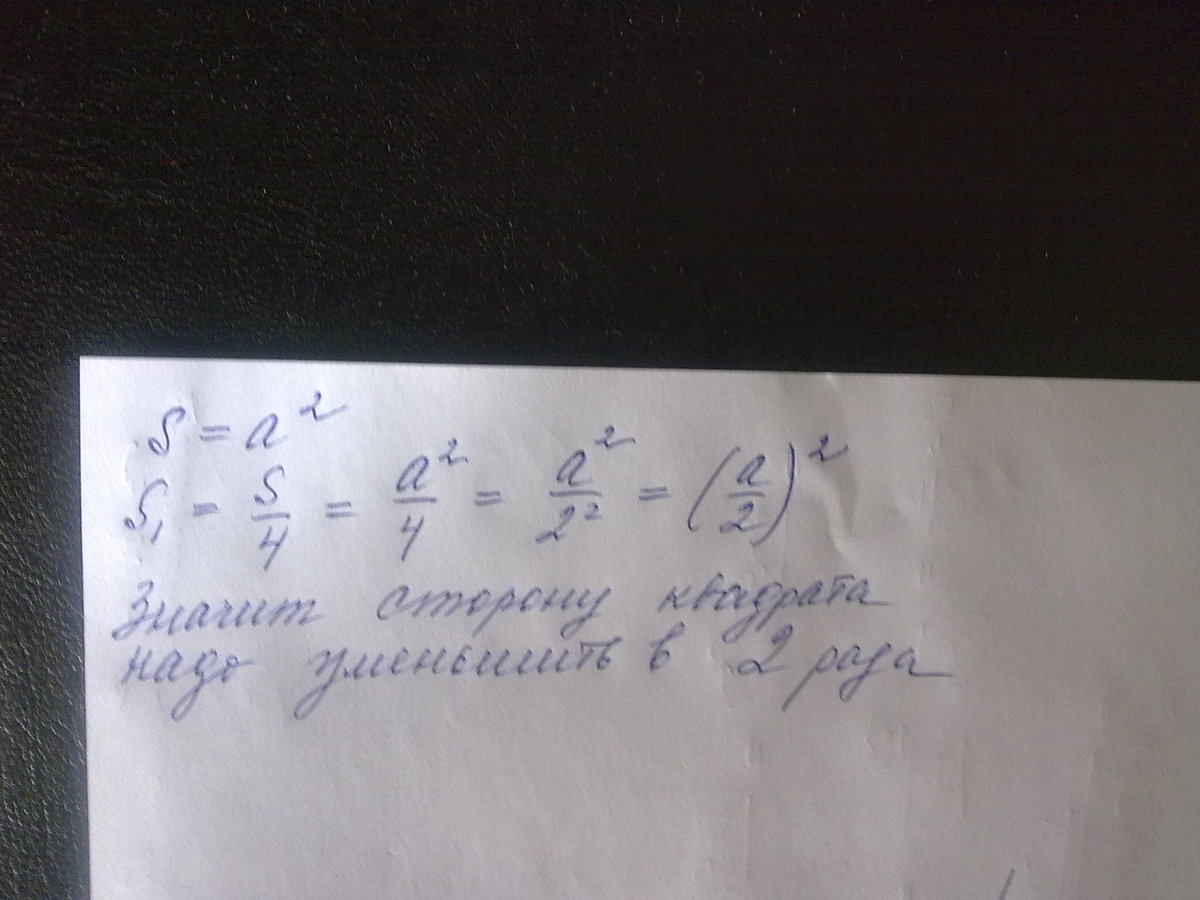 поэтому уменьшив сторону квадрата в 2 раза, площадь уменьшится в 2*2=4 раза