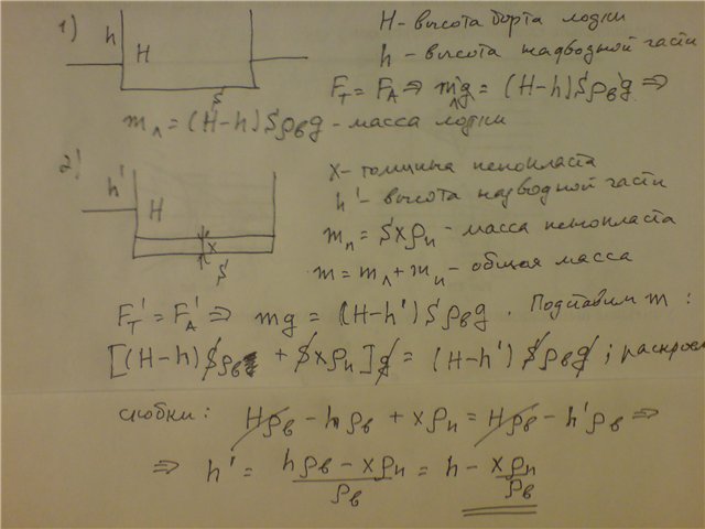 Высота надводной части лодки-плоскодонки равнялась 20 см. К днищу лодки со стороны воды по всей его площади приклеили пенопласт плотностью 400 кг/м^3 и толщиной 5 см. Определить высоту надводной части лодки, после наклеивания пенопласта.