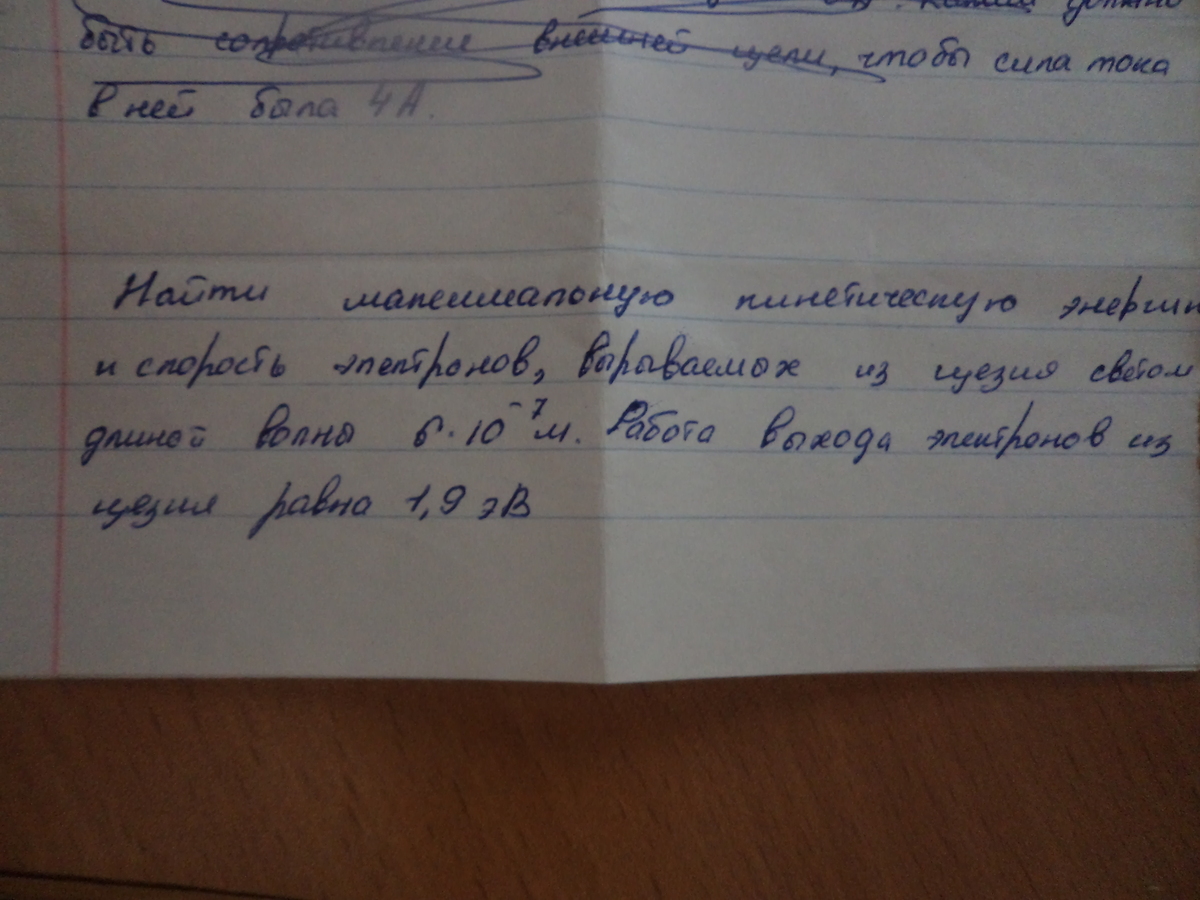 1. Найти Максимальную кинетическую энергию и скорость электронов, вырываемых из цезия световой длиной волны 6*10 в -7 степени м. Работа выхода электронов из цезия равна 1,9 эВ.
