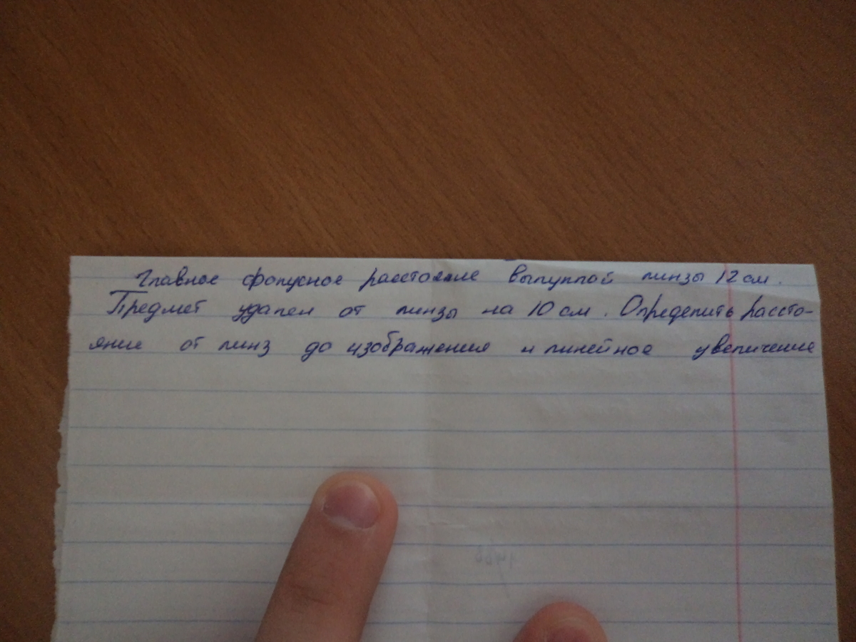 2. Главное фокусное расстояние выпуклой линзы 12см. Предмет удален от линзы на 10см. Определить расстояние от линз до изображения и линейное увеличение.
