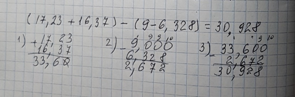 Разность суммы чисел 17,23 и 16,37 и разность чисел 9 и 6,328