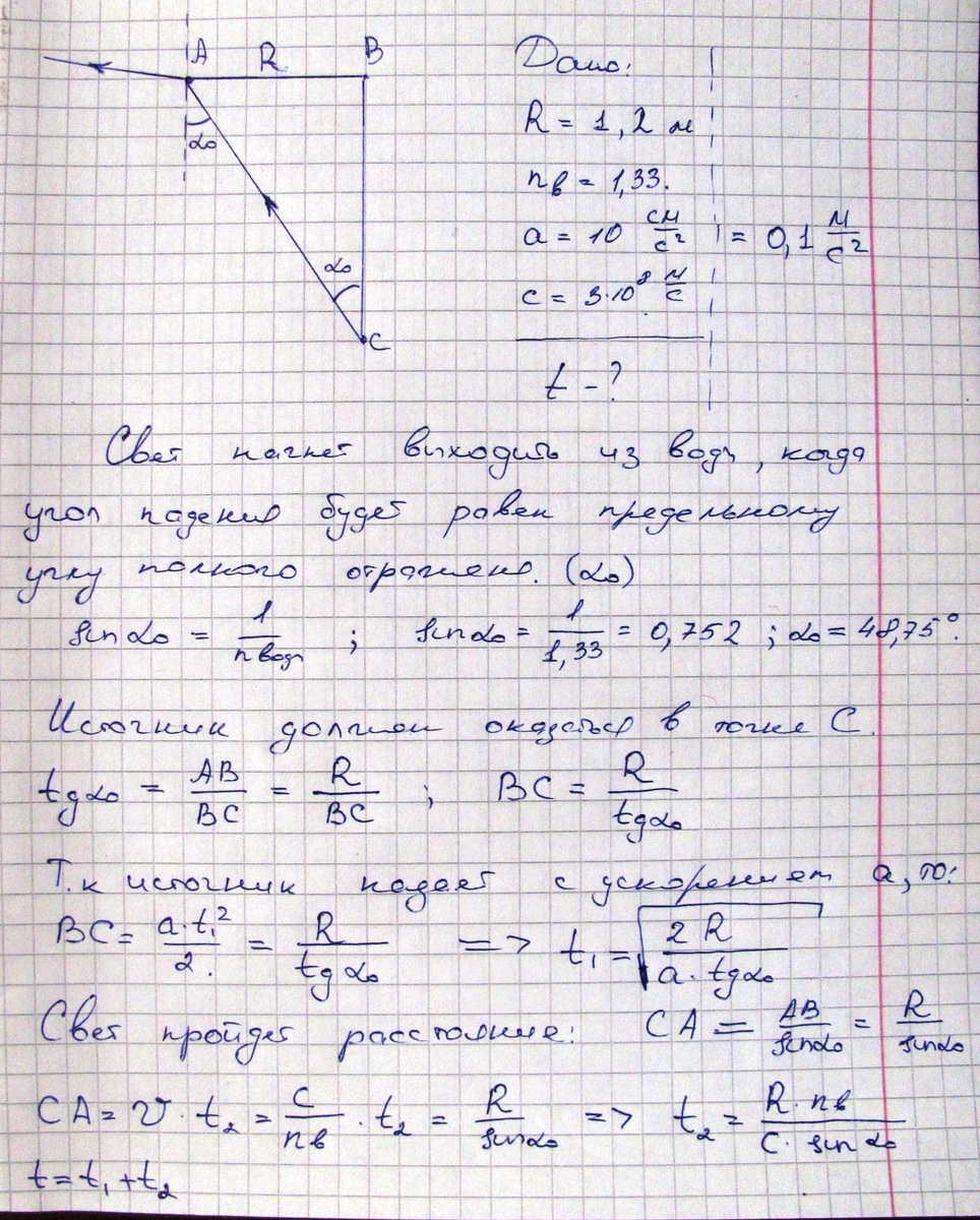 В бассейне на поверхности воды плавает непрозрачный круг радиусом R=1.2м. В центре нижней части круга находится точечный источник света, который в некоторый момент отрывается и падает вертикально вниз с ускорением а=10 см/с^2. Показатель преломления воды n=1.33 . Через какой минимальный промежуток времени лучи света от источника начнут выходить из воды в воздух?