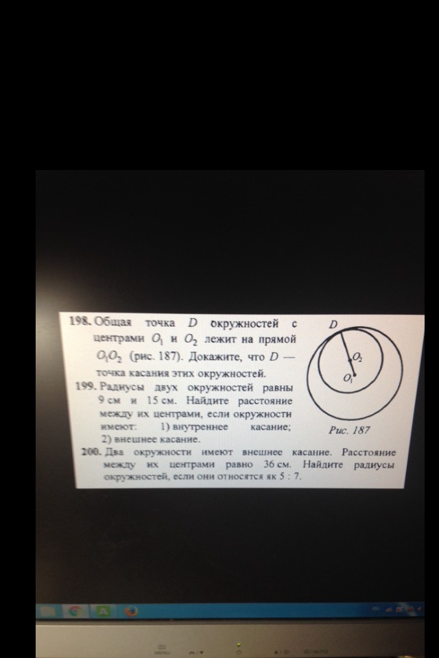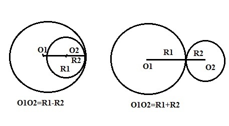 199.При внутреннем касании расстояние между центрами окружностей равно разности радиусов этих окружностей. При внешнем касании расстояние между центрами окружностей равно сумме радиусов этих окружностей.