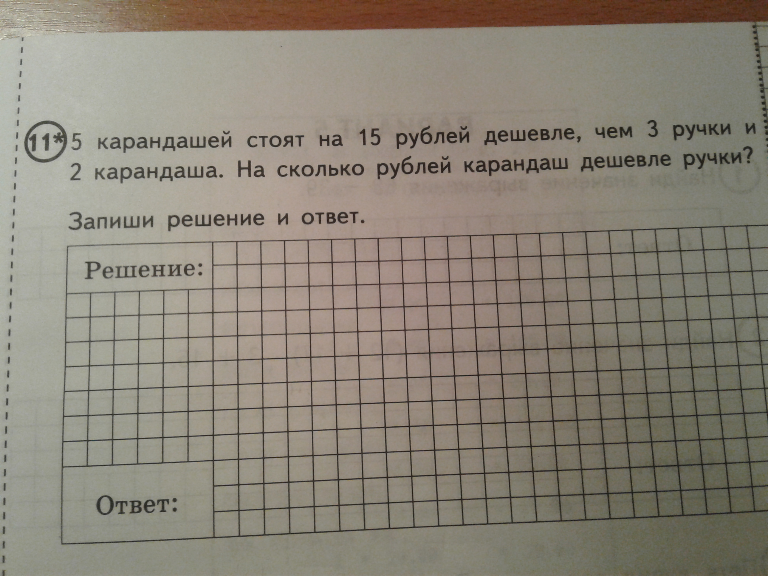 5 карандашей стоят на 15 рублей дешевле,чем 3 ручки и 2 карандаша. На сколько рублей карандаш дешевле ручки?