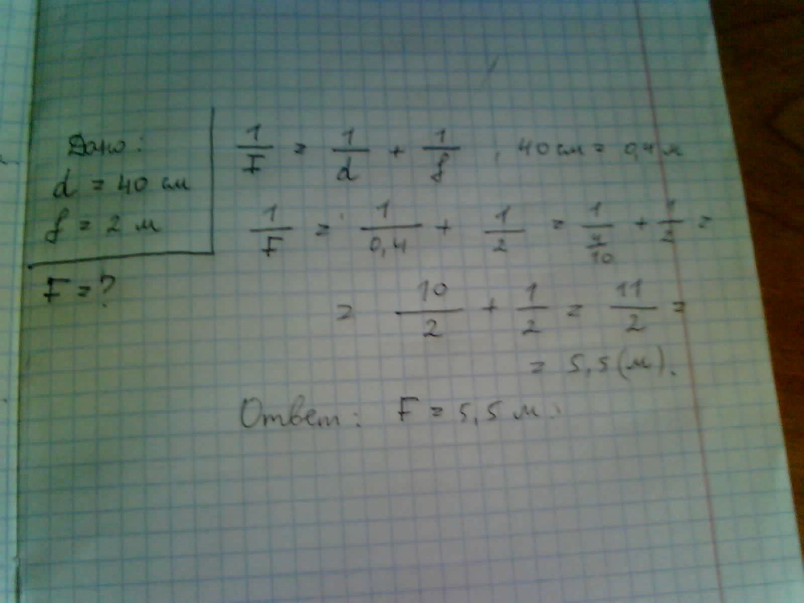 Определите фокусное расстояние линзы, если при расстоянии 40 см от линзы до предмета действительное изображение получается на расстоянии 2 м от линзы