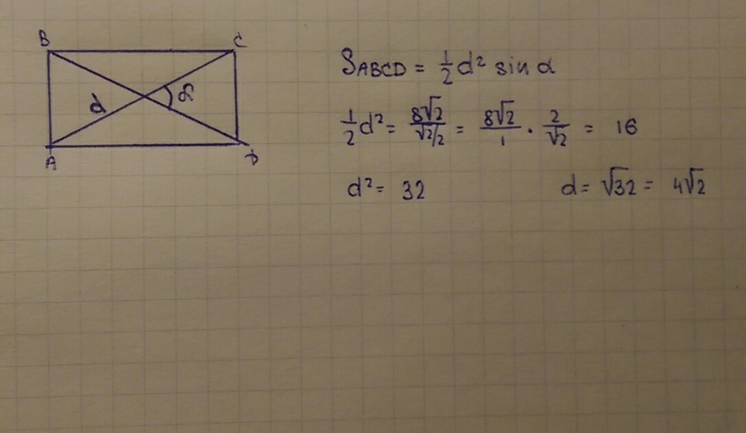 диагонали прямоугольника пересекаются под углом 45.найдите длину диагонали ,если площадь прямоугольника равна 8 корней из 2