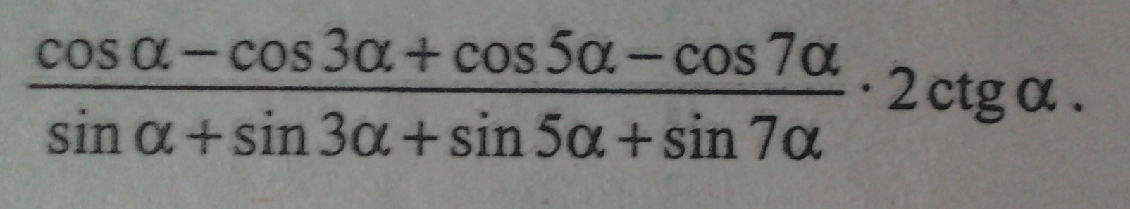(cosa-cos7a)-(cos3a-cos5a)/(sina+sin7a)+(sin3a+sin5a)*2tga=-(2sin4a*sin(-3a))-(-2sin4a*sin(-a))/(2sin4a*cos4a)+(2sin4a*cos4a)*2tga=2sin4a*sin3a-2sin4a*sina/4sin4a*cos4a*2tga=2sin4a(sin3a-sina)/4sin4a*cos4a*2tga=2sin2a*cos2a/2cos4a*2tga