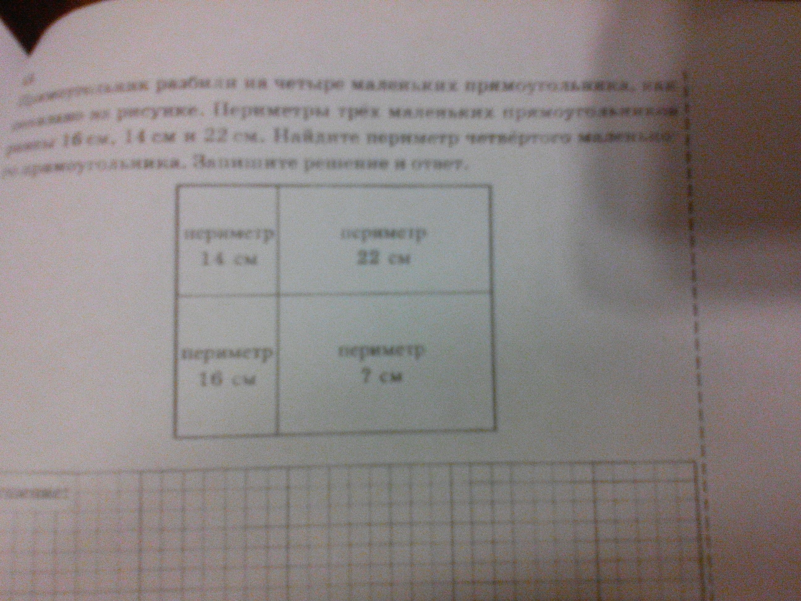 прямоугольникразбили на 4 маленьких прямоугольника, как показано на рисунке. Периметры трех маленьких прямоугольников равны 16см, 14 см, 22см. найдите периметр четвертого маленького прямоугольника. Зипиши решение и ответ.