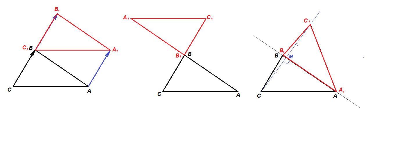 1) Из каждой вершины треугольника строим вектор, равный вектору СВ, соединяем концы векторов. Получаем ΔА₁В₁С₁.