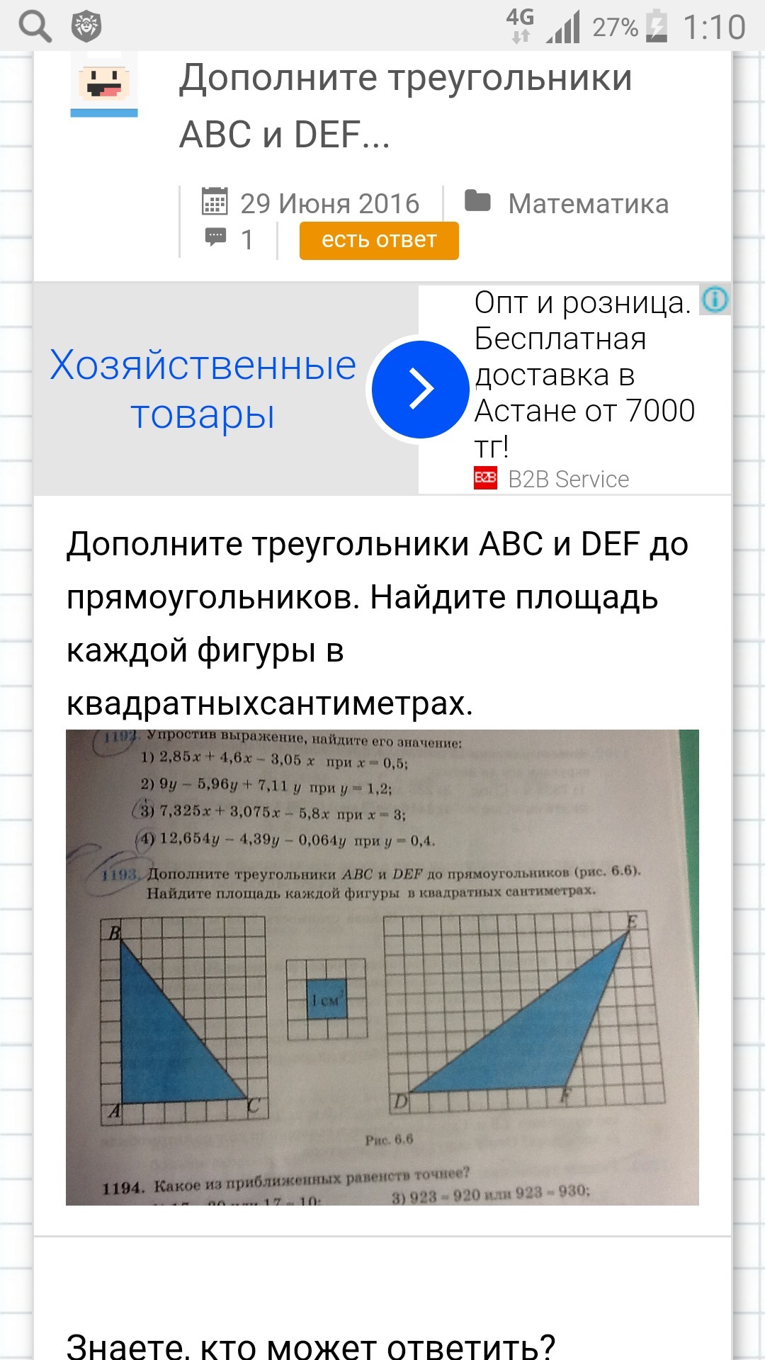Дополните треугольники ABC и DEF до прямоугольников. Найдите площадь каждой фигуры в квадратныхсантиметрах.