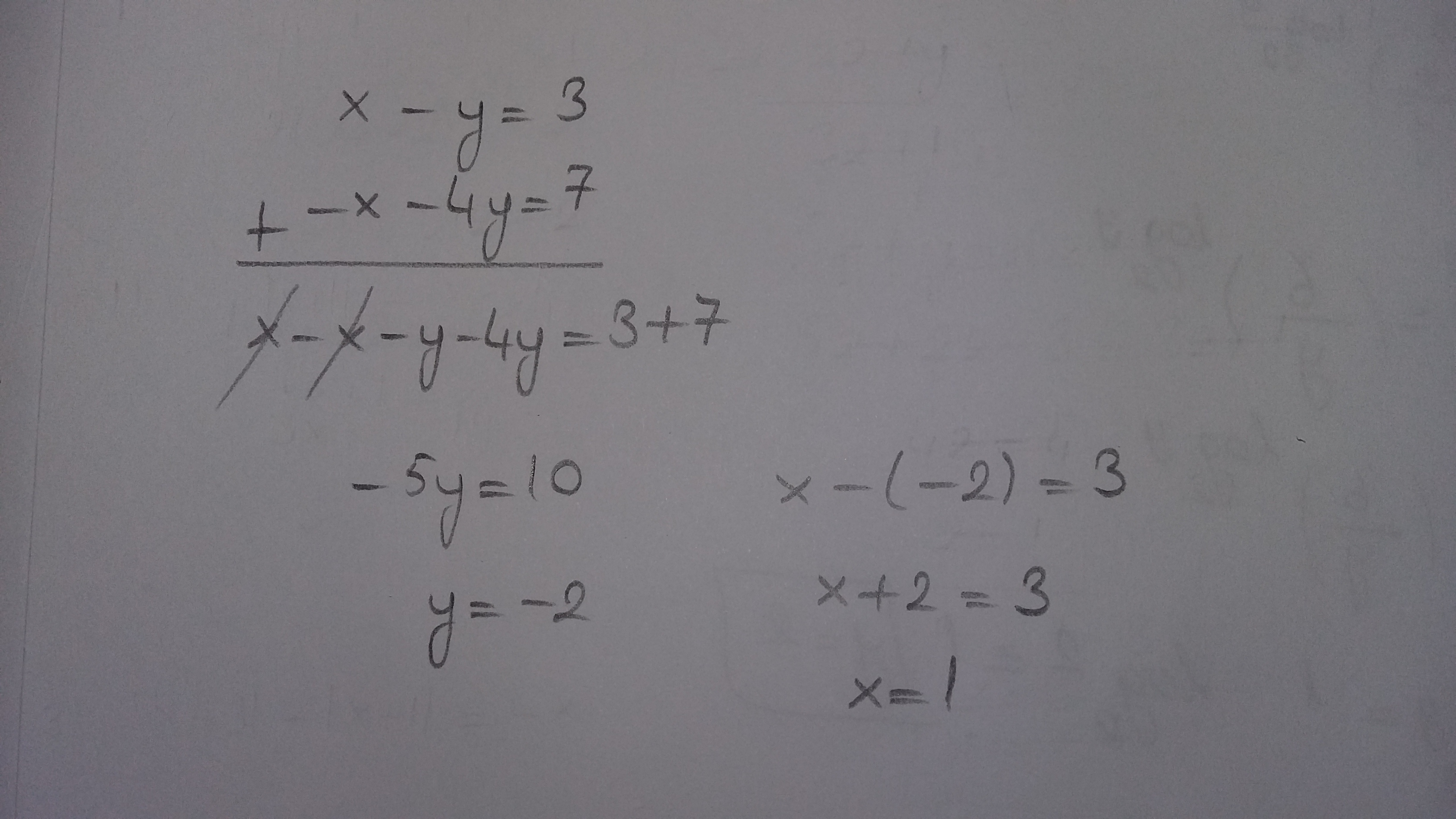 Введём значение переменной. Допустим, х=0. Получится 0- 4у=7. Значит, у=-1,75. Далее. Допустим х=2, Значит, 6-4у=7. у=0,25. Проводим первую прямую. Далее. х=0. у=1,5. х=2. у=-3,5 Находим точку пересечения. Ответ:х=1, у = -1