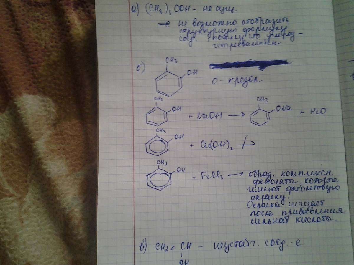 2) C6H4(CH3)OH - о-крезол (2-метилфенол); реаг-т с NaOH: C6H4(CH3)OH + NaOH = C6H4(CH3)ONa (2-метилфенолят натрия) + H2O, с FeCl3 дает компл-е соед-е: 6 C6H4(CH3)OH + FeCl3 = [Fe(C6H4(CH3)OH)6]Cl3 (трихлорид2-метилфенолят железа (3) - голубое окраш-е);