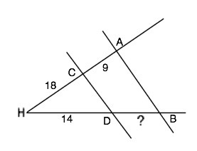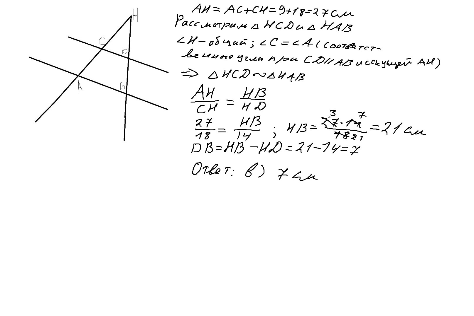 Параллельные прямые пересекают стороны угла AHB в точках A, B, C, D. Найдите длину отрезков DB, если AC=9 см, DH=14 см, CH=18 см.