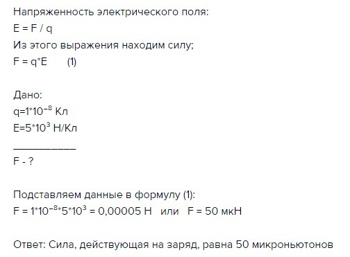 Ответ: Сила, действующая на заряд, равна 50 микроньютонов