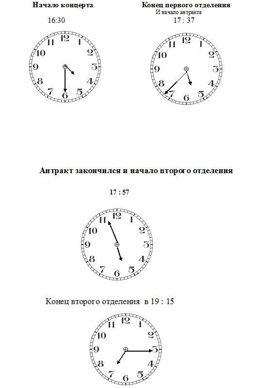 концерт из двух отделений начался в 16 ч 30 мин. Первое отделение концерта длилось 1 ч 7 мин, антракт занял 20 мин, а второе отделение продолжалось 1 ч 18 мин. Сколько времени прошло от начала концерта до его окончания? Вырази в часах и минутах время, записанное над каждым циферблатом. Выполни записи на соответствующих линейках. Нарисуй стрелки на каждом циферблате так, что бы они показывали записанное время.