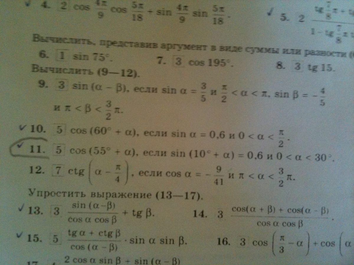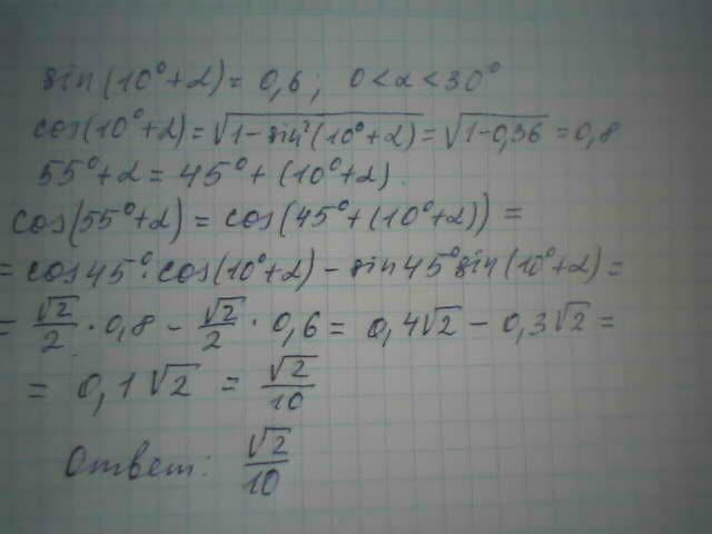 Пожалуйста помогите решить очень срочно, ноги расцелую тому кто решит))) Заранее спасибо за попытки))) Задание надо просто решить. cos(55градусов+альфа) , если sin(10градусов+альфа)=0,6 и 0<алфа<30 градусов. Напишу ешё раз чтобы было понятней cos(55*+a) , если sin(10*+a)=0,6 и 0<a<30*Это чистая трегонометрия)))Вот фото задиние №11.