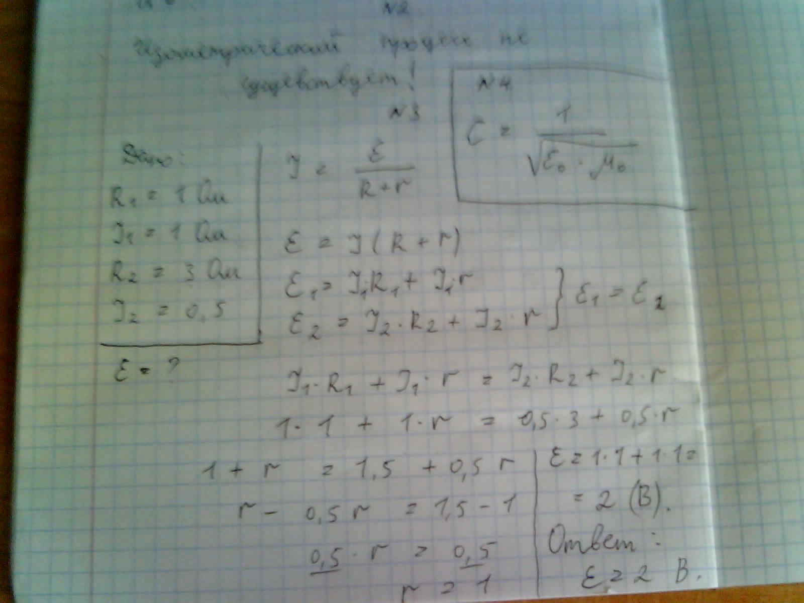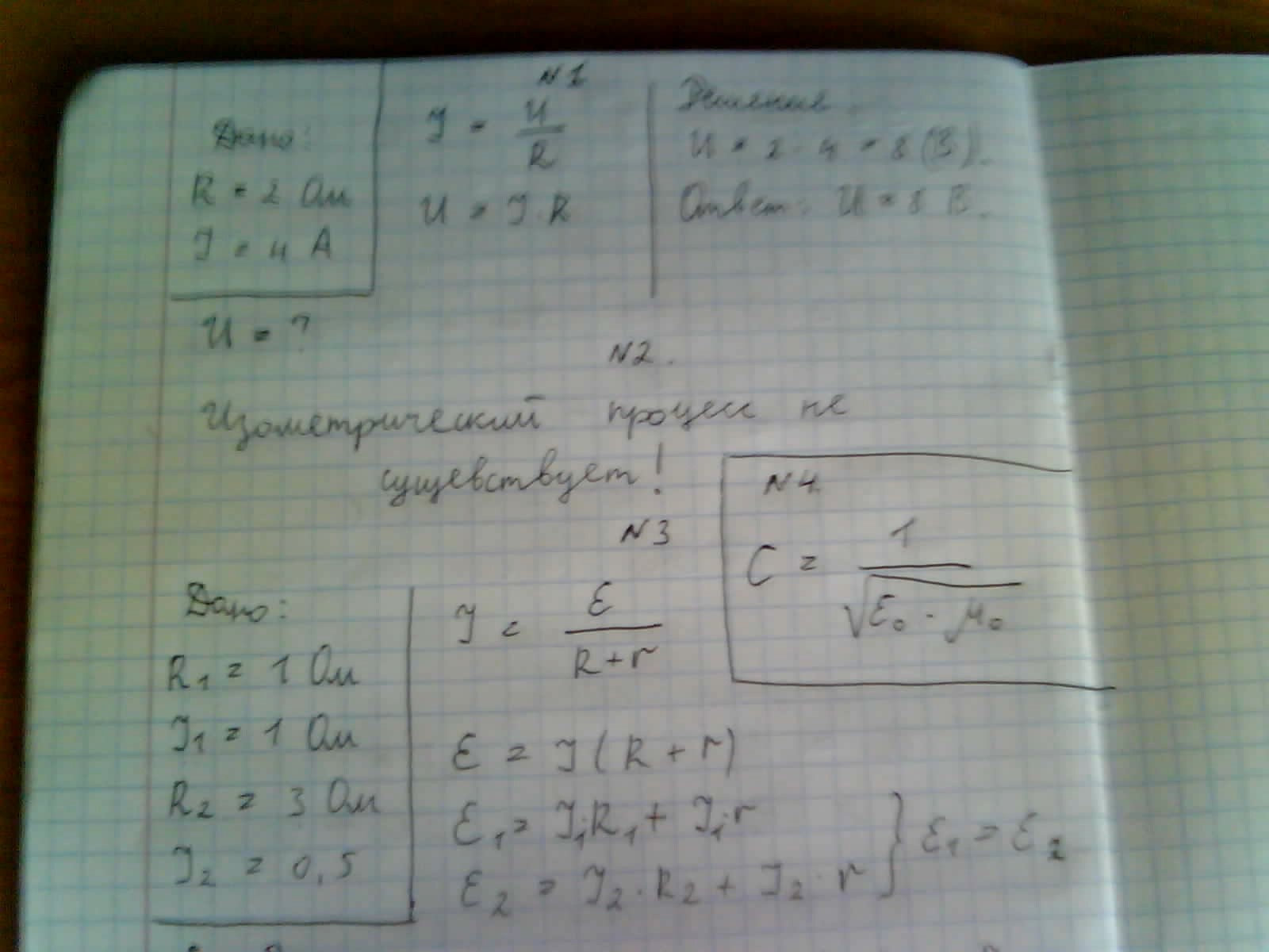 1.Какова напряжение на участке цепи постоянного тока с электрическим сопротивлением 2 ом при силе тока 4А. 2.Формула изометрического процесса. 3.При подключений к источнику постоянного тока резистора с сопротивлением 1 ом сила тока в цепи равна 1А, а при сопротивлений 3 ом, сила тока составляет 0.5 А.Найти эдс 4. Скорость света в однородной среде (формула)