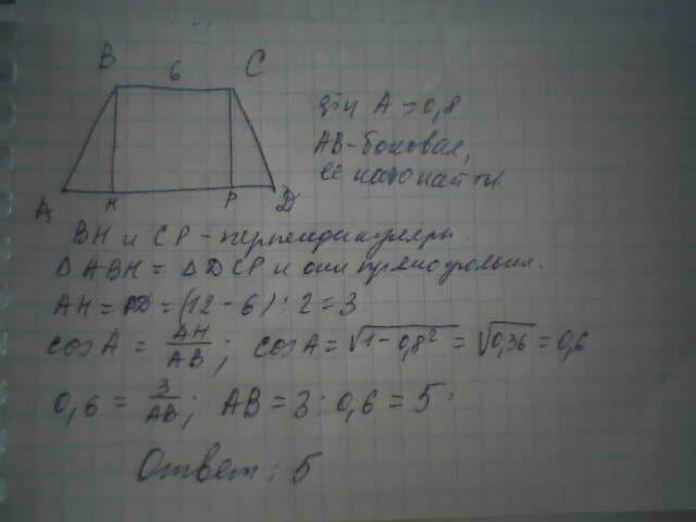 основания равнобедренной трапеции равны 6 и 12. синус острого угла трапеции равен 0,8. наити боковую сторону