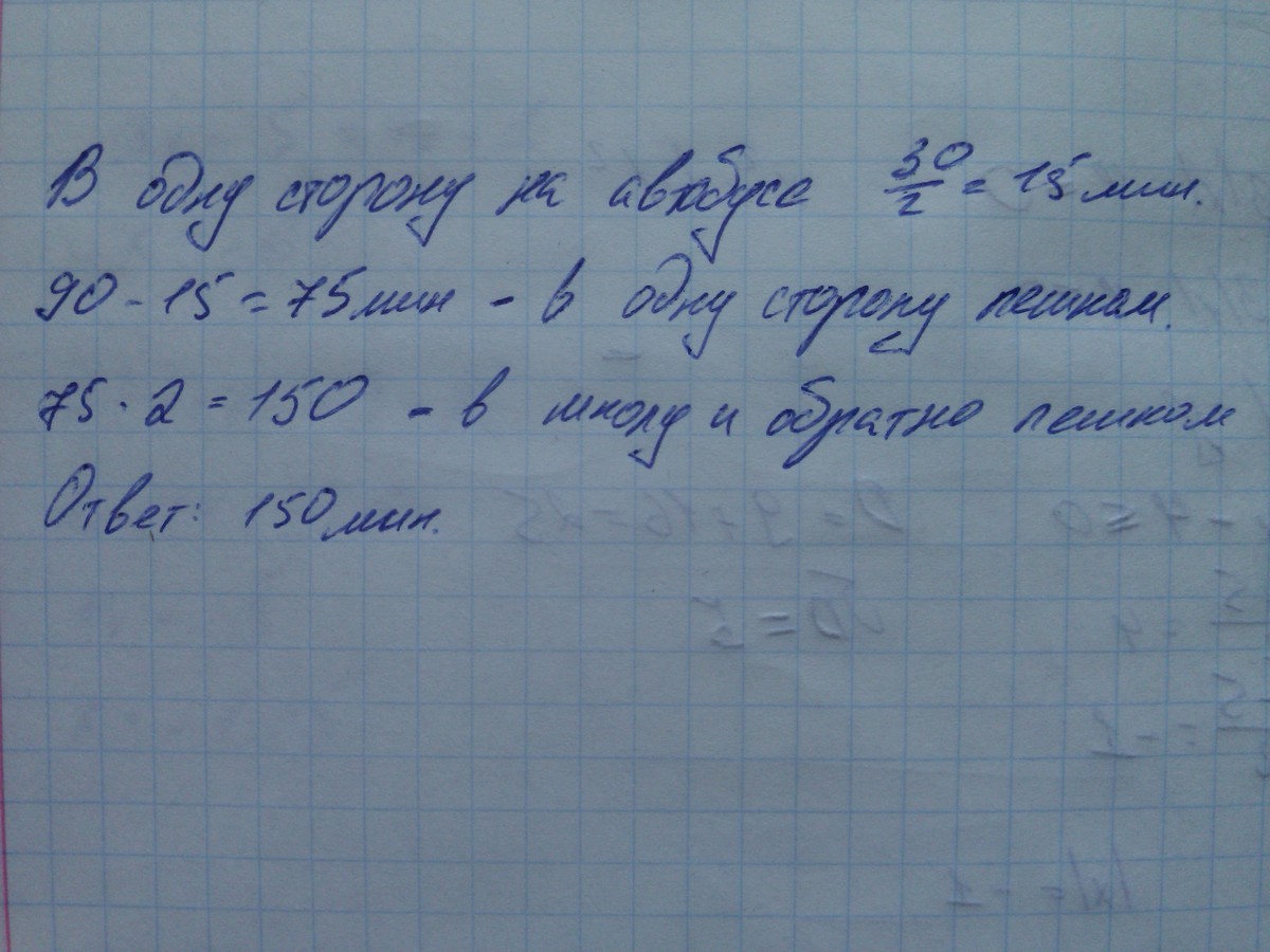 1) 30 : 2 = 15 мин. -(поездка на автобусе в один конец.)