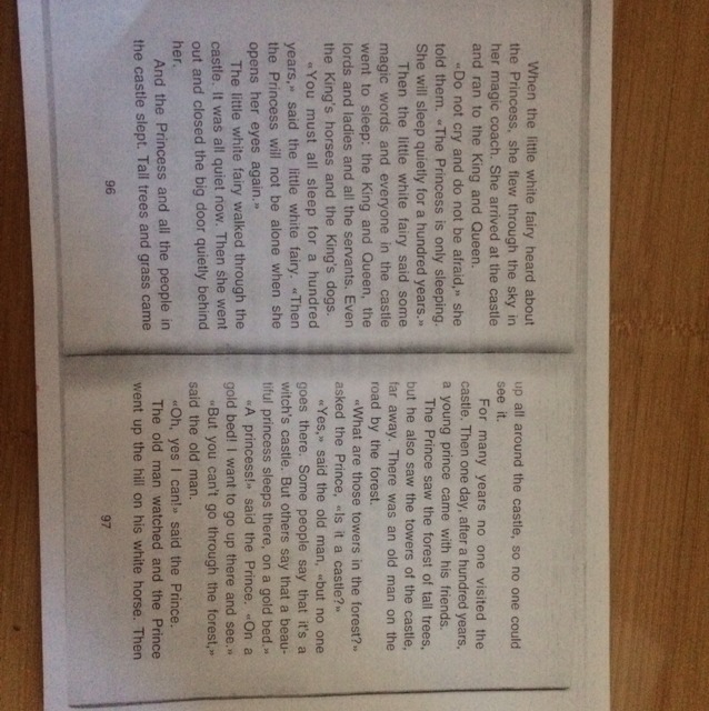 Когда маленькая белая фея слышал оПринцесса. она летела по небу вее волшебная карета. Она прибыла в замоки побежал к королю и Королеве.Не плачь и не бойся, онасказал им: по адресу: Принцесса всего лишь спитОна будет спокойно спать в течение ста лет.Тогда маленькая белая фея сказала, что некоторыеволшебные слова и все в замкепошел крутой: Король и Королева, дамы и господа, и слуги. Дажелошади царя и царских собак.Вы должны ал ТОР спать сталет, сказала маленькая белая фея.Принцесса не будет одинок, когда онаснова открывает глаза-Облегченная белая фея прошлась поЗамок. Теперь Аль-тихо. Потом она пошлавышел и тихо закрыл большую дверь позадиИ принцесса, и все люди взамок спал высокие деревья и трава амсвоможет 4увидеть его.В течение многих лет никто не посещалзамок. Однажды, после сто лет.приехал молодой принц со своими друзьями.Принц увидел, что лес высоких деревьев.но он также увидел башни замка,далеко. Там был старый человек надорога по лесуЧто это за вышки в лесу?Инк, это Каскрасители, сказал старикходит туда. Некоторые люди говорят, что этоведьмы замка. Но другие говорят, что бопрекрасные принцессы там спит на Золотой кровати.ка-принцесса! сказал Принц. НаЗолотая кровать! хотите пойти туда и увидел,Но Вы не можете пойти через лессказал старикДа может! сказал Принц,Старик смотрел и Принцподнялся на холм на своем белом коне. Тогда