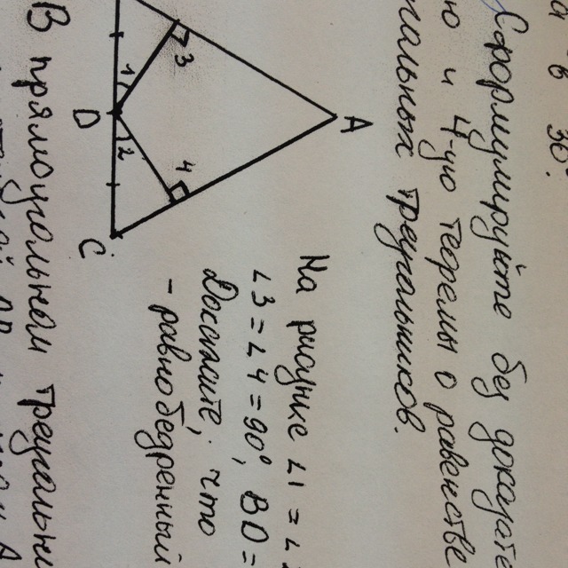 Треугольник ВD(3), равен треугольнику DC(4) по катету и острому углу. В равных треугольниках, на против равных сторон лежат равные углы. Угол C= углу B.