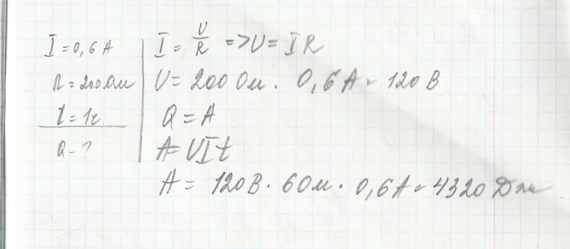 Сила тока в обмотке паяльника 0,6 А, сопротивление 200 ОМ, время работы 1 час, найти кол-во теплоты.