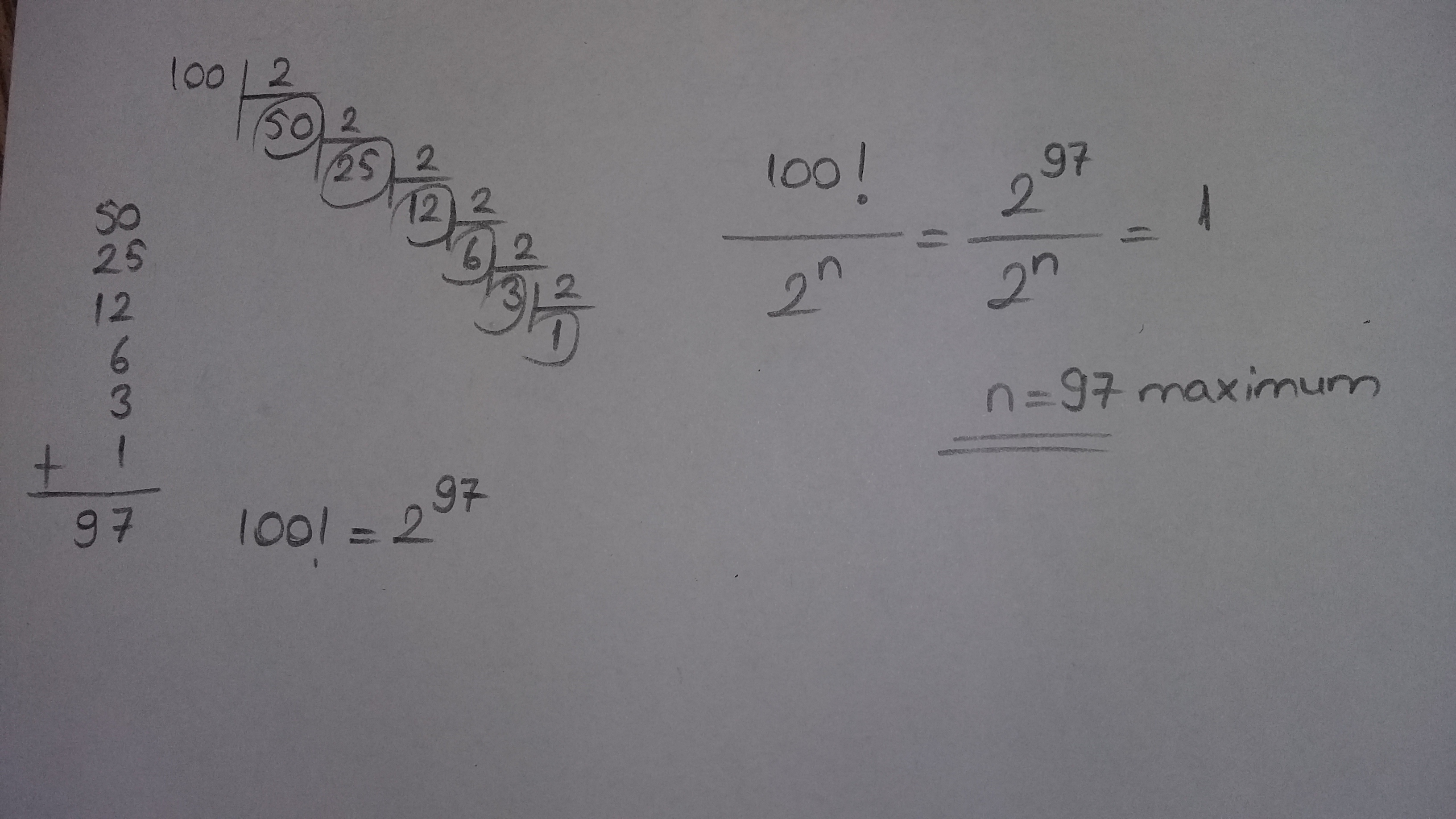 Каково максимальное значение n, при котором 100! (факториал) делится на  2^{n}