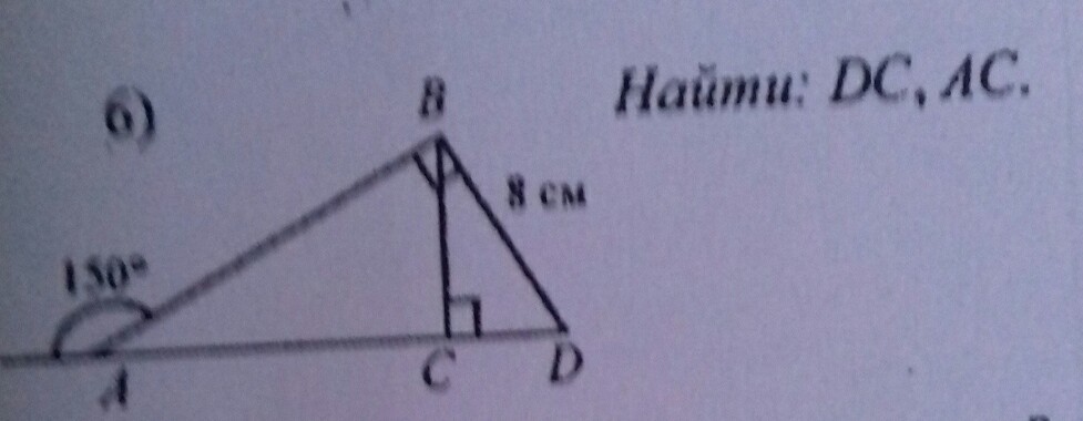 1. Найдем углы в треугольнике ABC Мы знаем внешний угол (150*), смежный с углом А. Тогда угол А будет равен 30 * Угол С = 90 *, угол ABC равен 60 *, т.к. 180* - (90*+30*) = 60*. Итак, у нас есть все углы треугольника ABC. Теперь найдем углы треугольника BCD. Известно, что угол С = 90*, тогда угол DBC равен 30* (90* - 60*), а угол D равен 60*.