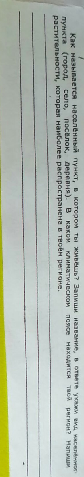 Всем привет!помогите пожалуйста с вопросом : как называется населённых пункт,в котором ты живёшь? запиши название,в ответе укажи вид населённой растительности,которая наиболее распространена в твоём регионе. (я живу в Архангельской области). заранее спасибо!