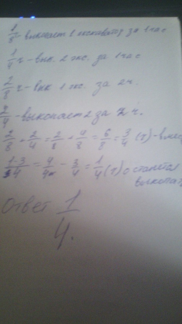 Первый экскаватор может выкопать траншею за 8 часов,а второй-за 4 часа.Какую часть траншеи останется выкопать после 2 часов совместной работы двух экскаваторов?