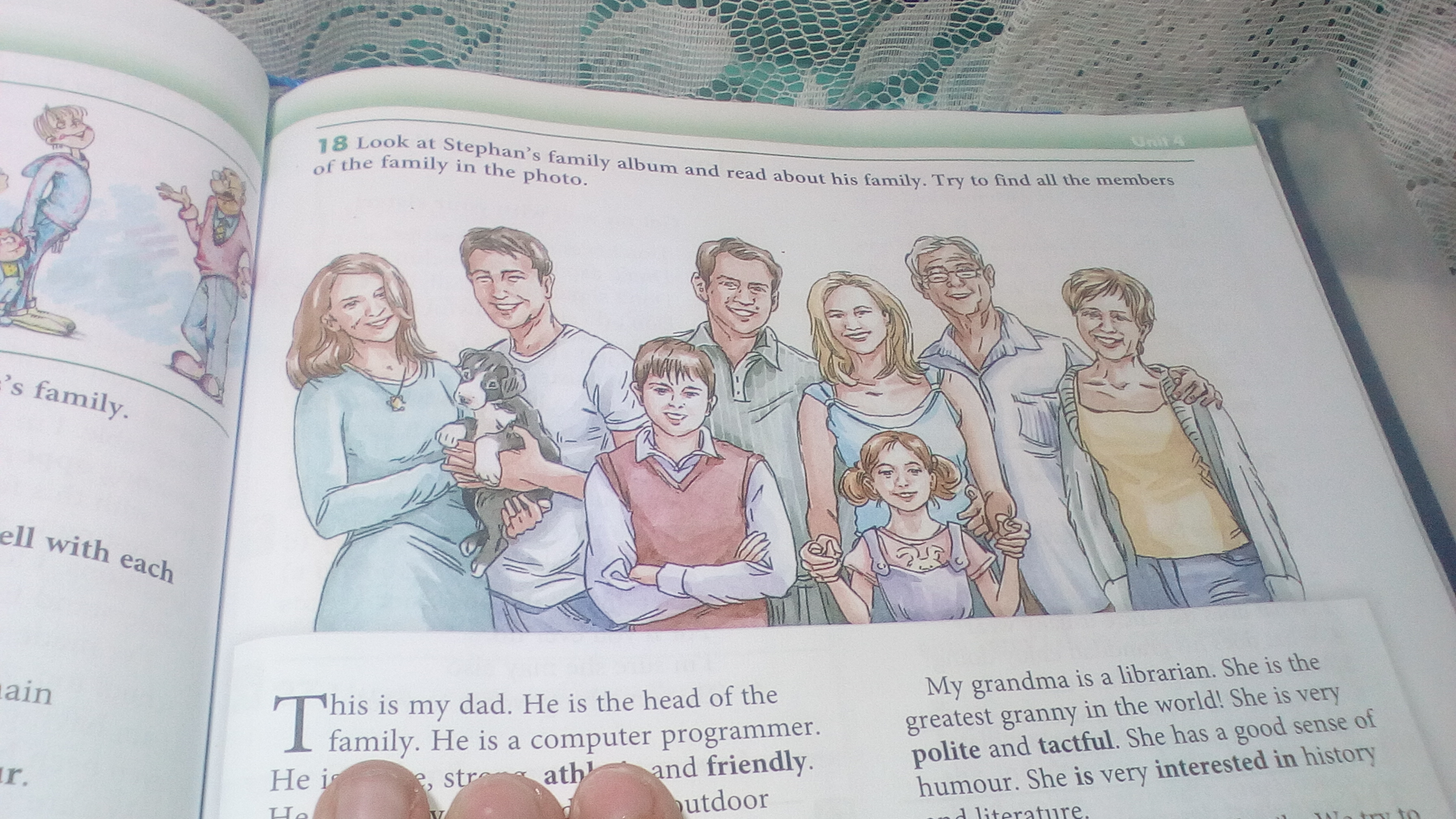 На фотографии изображена большая семья. Бабушка и дедушка выглядят очень счастливыми. Еще на фотографии избражена мама и папа 3 детей. Старший сын стоит со своей женой. Дети очень счастливые. И также в этой семье есть собака. Которую все члены семьи любят