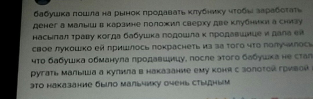 бабушка пошла на рынок продавать клубнику чтобы заработать денег в малыш в карзине положил сверху две клубники а снизу насыпал траву когда бабушка подошла к продовщице дала ей своё лукошко ей пришлось покраснеть из за того что получилось что бабушка обманула продавщицу, после этого бабушка не стала ругать малыша в купила в наказание ему коня с золотой гривой в это наказание было мальчику очень стыдным.