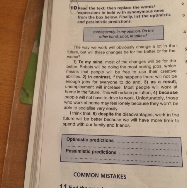 Pessimistic predictions: Unemployment will increase. People who work at home may feel lonely, because they won't be able to socialize very easily