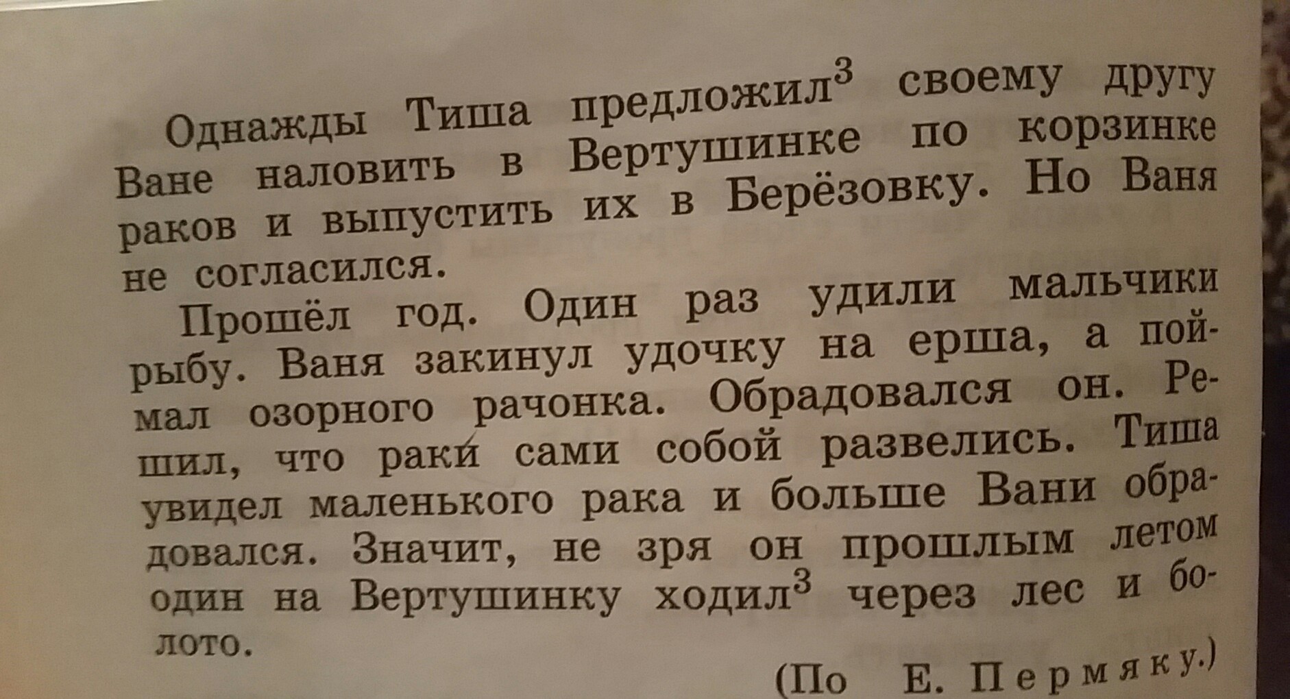 Однажды Тиша предложил своему другу Ване наловить раков и выпустить их в Берёзовку.Но Ваня не согласился. Прошёл год. Один раз ловили (удили)они рыбу. Ваня закинул удочку на ерша а поймал рачонка. Он так обрадовался. Решил ,что раки сами развелись. Тиша обрадовался сильнее Вани. Значит,не зря прошлым летом один на Вертушеньку сходил.