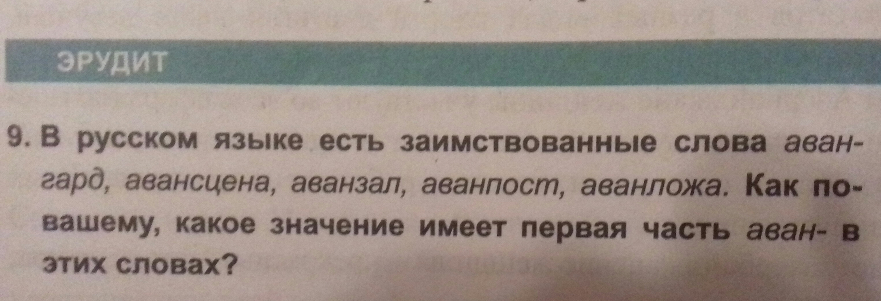 Аван — avant m. составе многих сложных слов имеет знач. передний край, часть , напр.,авангард, авансцена, аванзал, аванложа