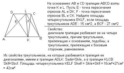 На основаниях АВ и СD трапеции ABCD взяты точки K и L. Пусть Е - точка пересечения отрезков AL и DK, F - точка пересечения отрезков BL и CK. Найдите площадь четырехугольника EKLF, если площадь треугольников ADE - 15 см^2, а BCF - 27 см^2